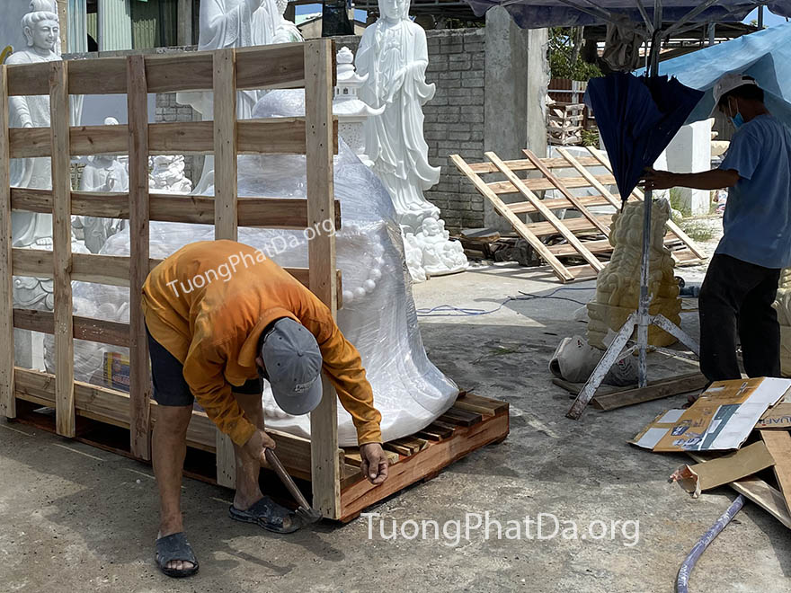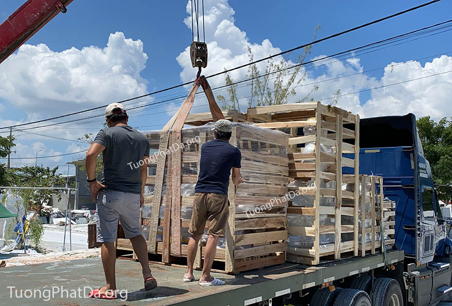 Hình ảnh Cơ sở Điêu khắc Tượng Phật Đá Phan Sơn (TuongPhatDa.org) điêu khắc, hoàn thiện, đóng kiện và cẩu lên xe để giao Tượng Phật Di Lặc bằng đá ngang 1,83m cho khách hàng.
