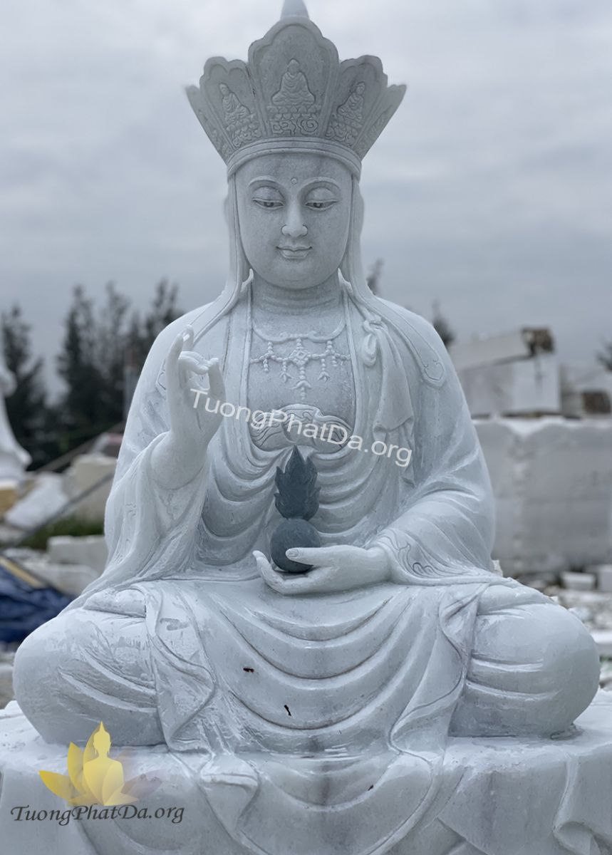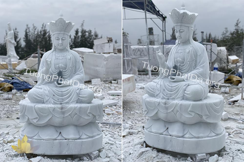 Tượng Địa Tạng Vương Bồ Tát ngồi đài sen bằng đá trắng xanh tự nhiên được sản xuất trực tiếp tại cơ sở TuongPhatDa.org